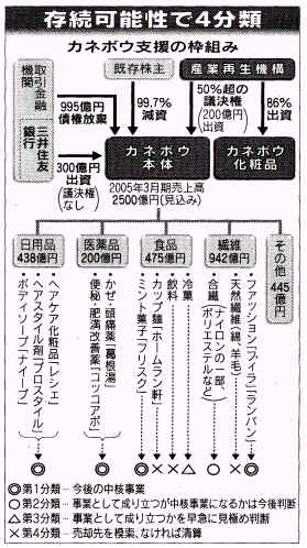 カネボウが産業再生機構の支援を受ける。売上高5千億円、従業員数1万4千人の巨大企業が国のひ護の下、再建を目指す事態になった。名門の迷走はなぜ起こり、どういう意味を持つのか。